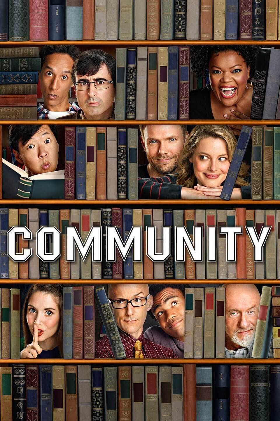 Poster for TV show Community, showing people of different ethnicities through a bookshelf