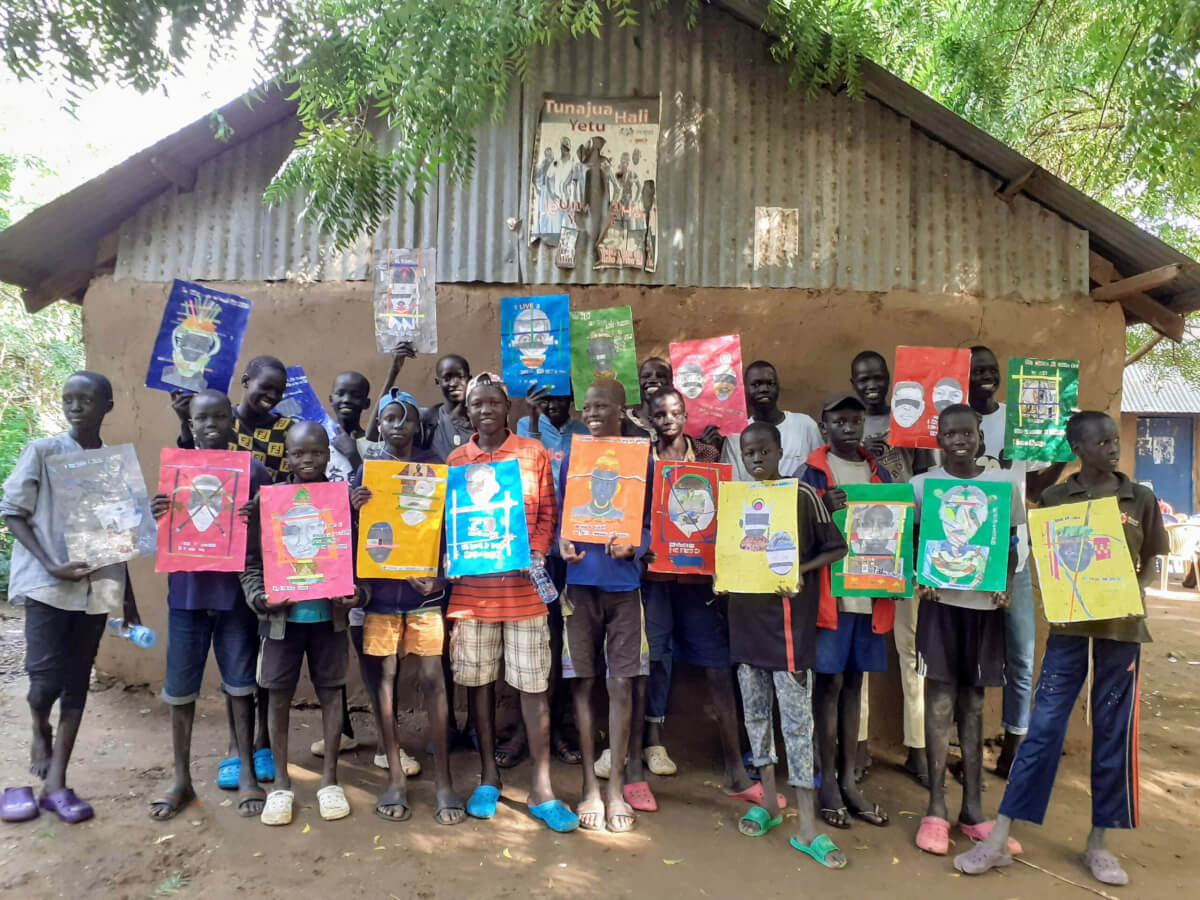 In phase two of this collaboration, Stone Soup students participated in a two-part workshop in which they learned about what it means to be a refugee more generally, as well as the specific elements of the lives of Kakuma Camp residents that inspired their artwork. Participants then added to the piece of artwork created by the South Sudanese boys in Kakuma Camp, seeking to highlight the work of the original artist and create a sense of visual dialogue between the two. This artistic adventure endeavored to inspire a sense of solidarity, partnership, and collaboration between contributing artists from refugee backgrounds and other Stone Soup contributors interested in engaging with them and learning about their lives.